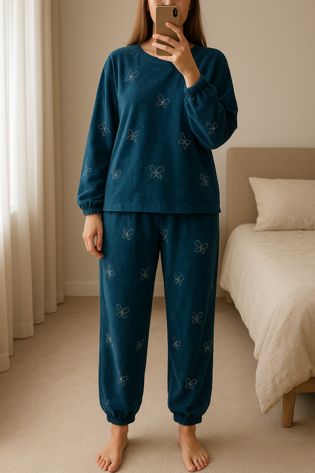 Tuta diamond in piedi, rivolto verso la fotocamera, in una camera da letto con luce soffusa e luce naturale che filtra dalla finestra.