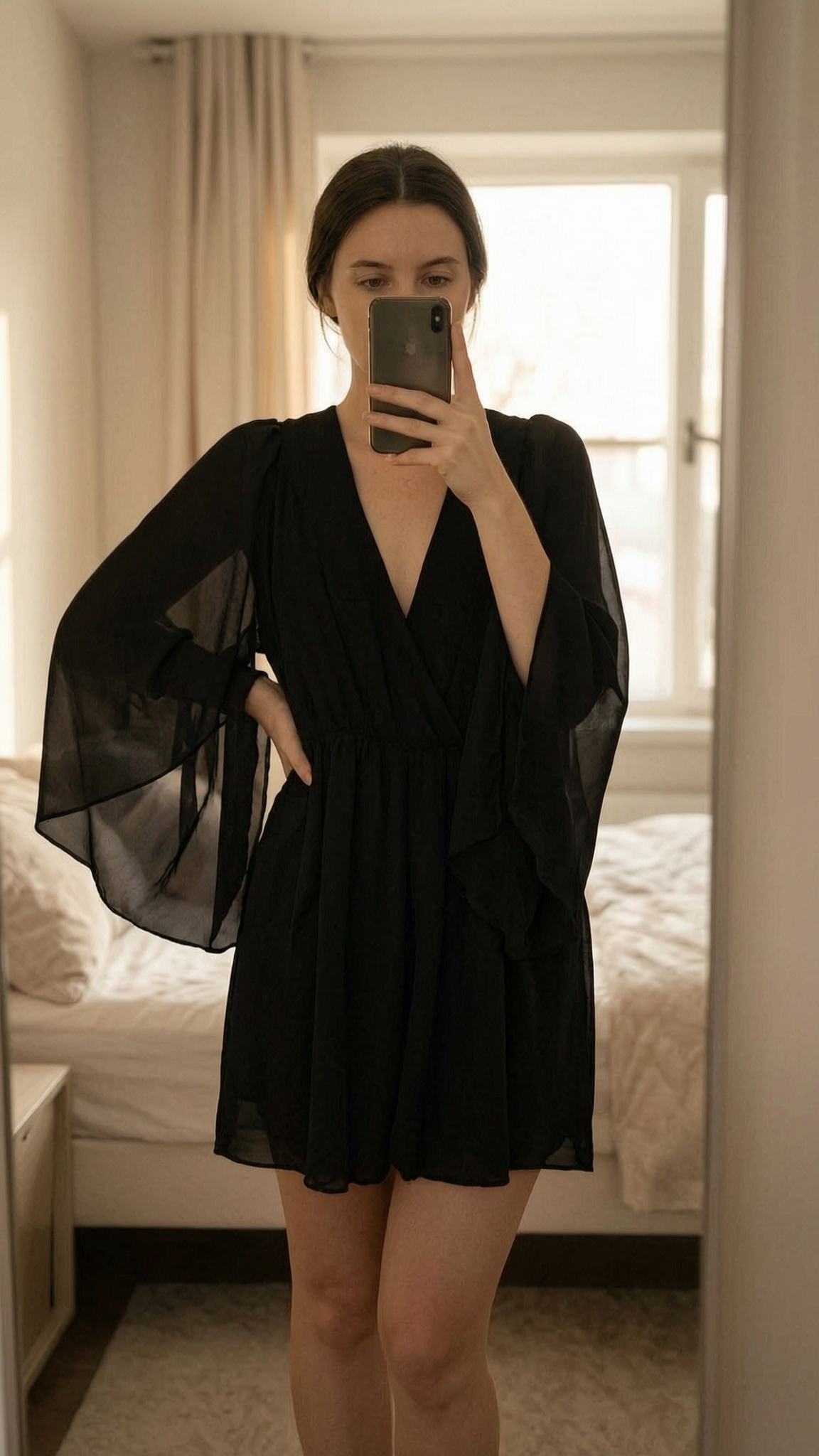 Tutina nera a pantaloncino con maniche ampie 🖤 in piedi, rivolto verso la fotocamera, in una camera da letto con luce soffusa e luce naturale che filtra dalla finestra.