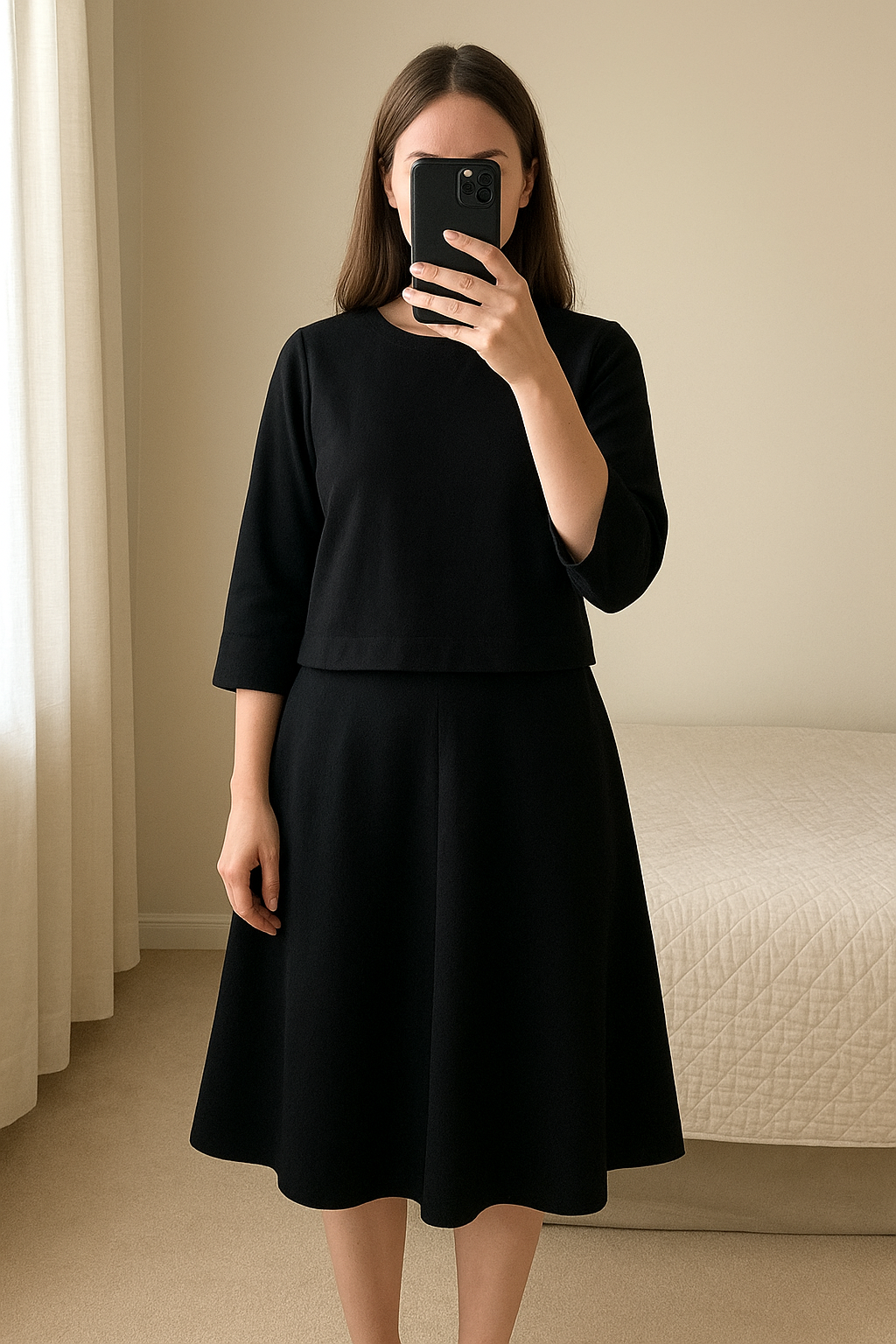 Uniqlo skirt and shirt combo debout, face à la caméra, dans une chambre à la lumière douce, avec une lumière naturelle filtrant par la fenêtre.