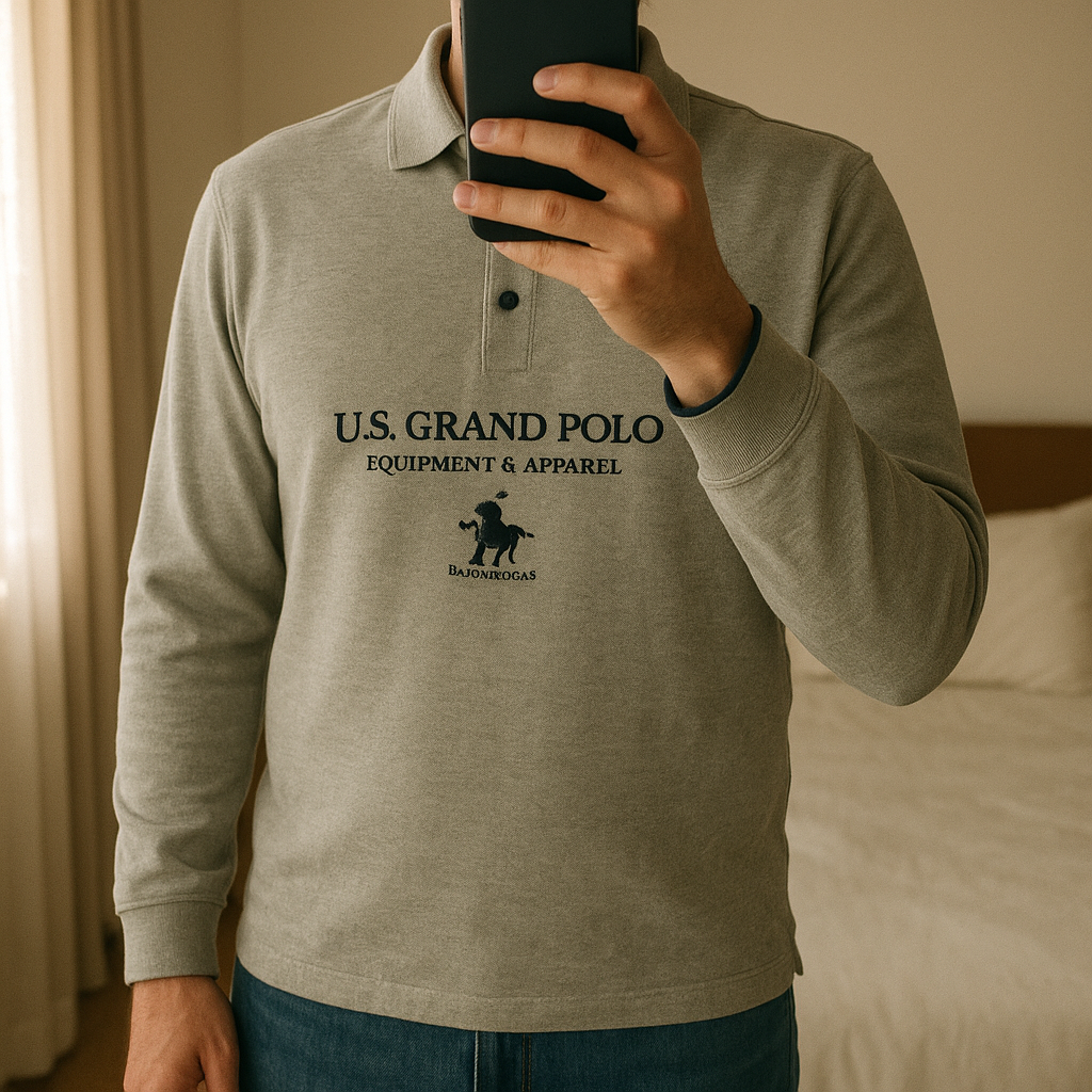 us grand polo taille L debout, face à la caméra, dans une chambre à la lumière douce, avec une lumière naturelle filtrant par la fenêtre.