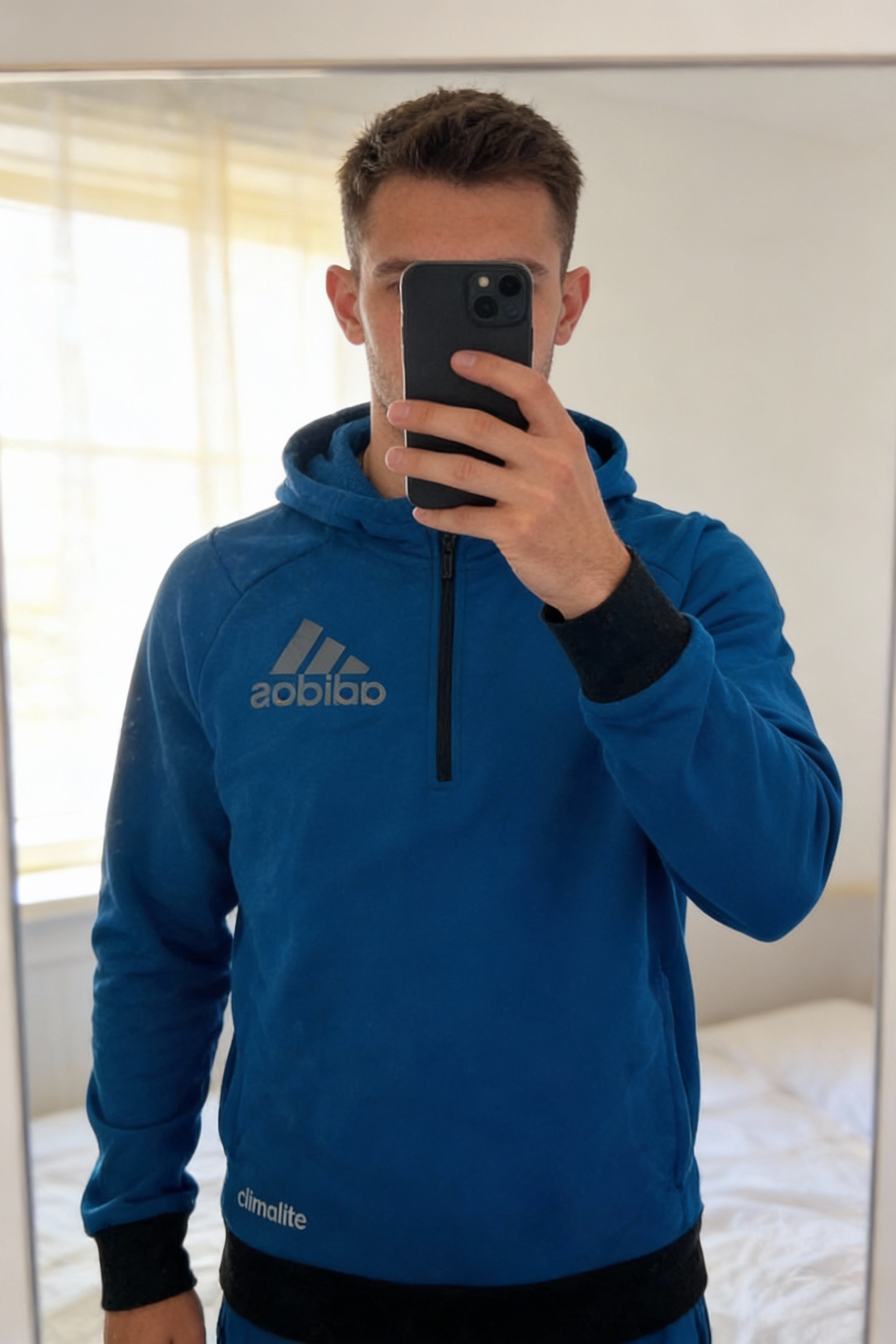 Veste Adidas Uni Bleu debout, face à la caméra, dans une chambre à la lumière douce, avec une lumière naturelle filtrant par la fenêtre.