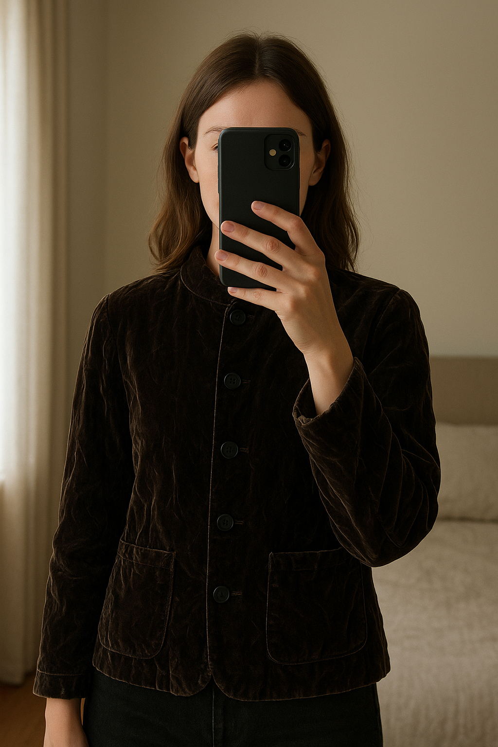 Veste Armani debout, face à la caméra, dans une chambre à la lumière douce, avec une lumière naturelle filtrant par la fenêtre.