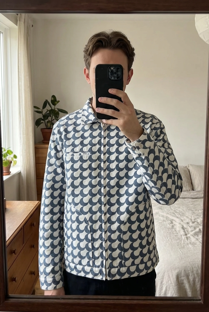 Veste Arte lune debout, face à la caméra, dans une chambre à la lumière douce, avec une lumière naturelle filtrant par la fenêtre.