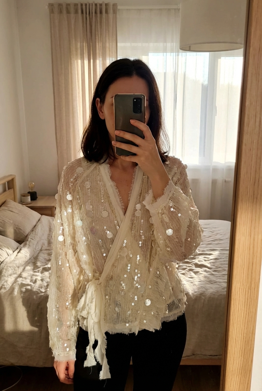 Veste blanche debout, face à la caméra, dans une chambre à la lumière douce, avec une lumière naturelle filtrant par la fenêtre.