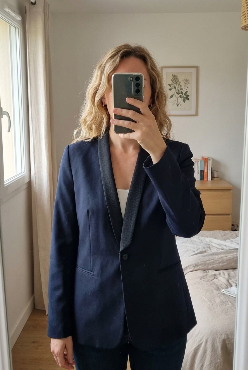 Veste blazer Chattawak bleu nuit 42 neuve debout, face à la caméra, dans une chambre à la lumière douce, avec une lumière naturelle filtrant par la fenêtre.