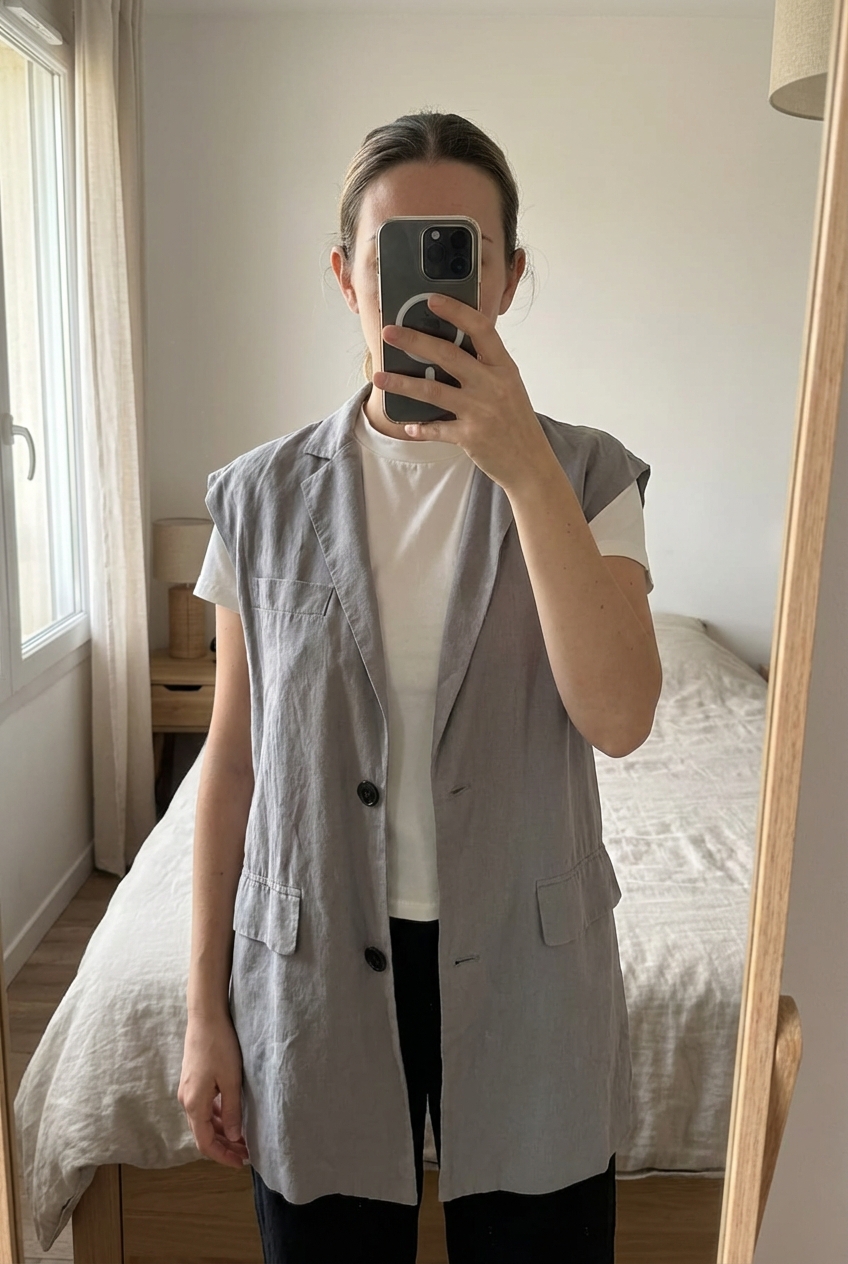 Veste blazer sans manche debout, face à la caméra, dans une chambre à la lumière douce, avec une lumière naturelle filtrant par la fenêtre.
