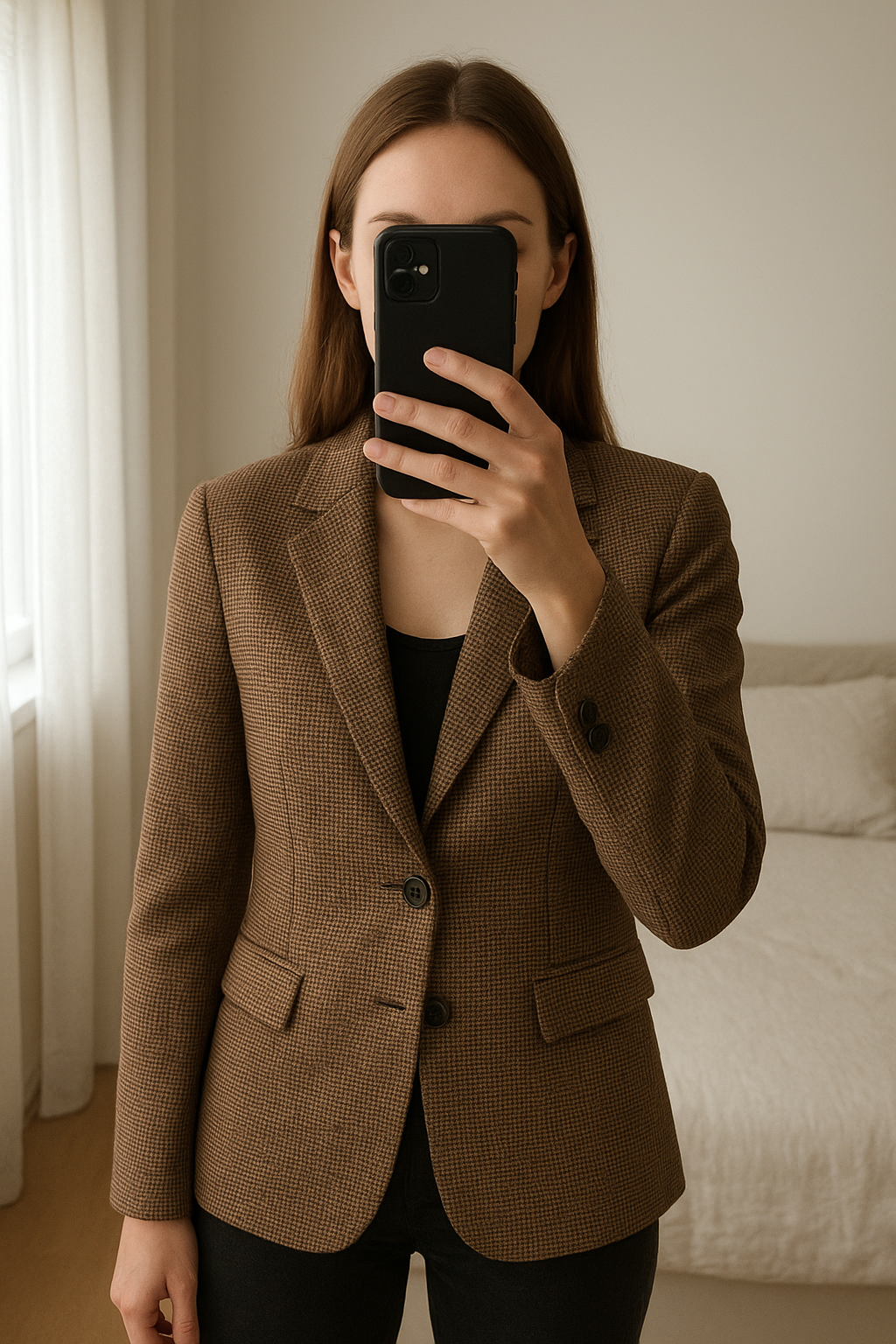 Veste blazer t40 debout, face à la caméra, dans une chambre à la lumière douce, avec une lumière naturelle filtrant par la fenêtre.