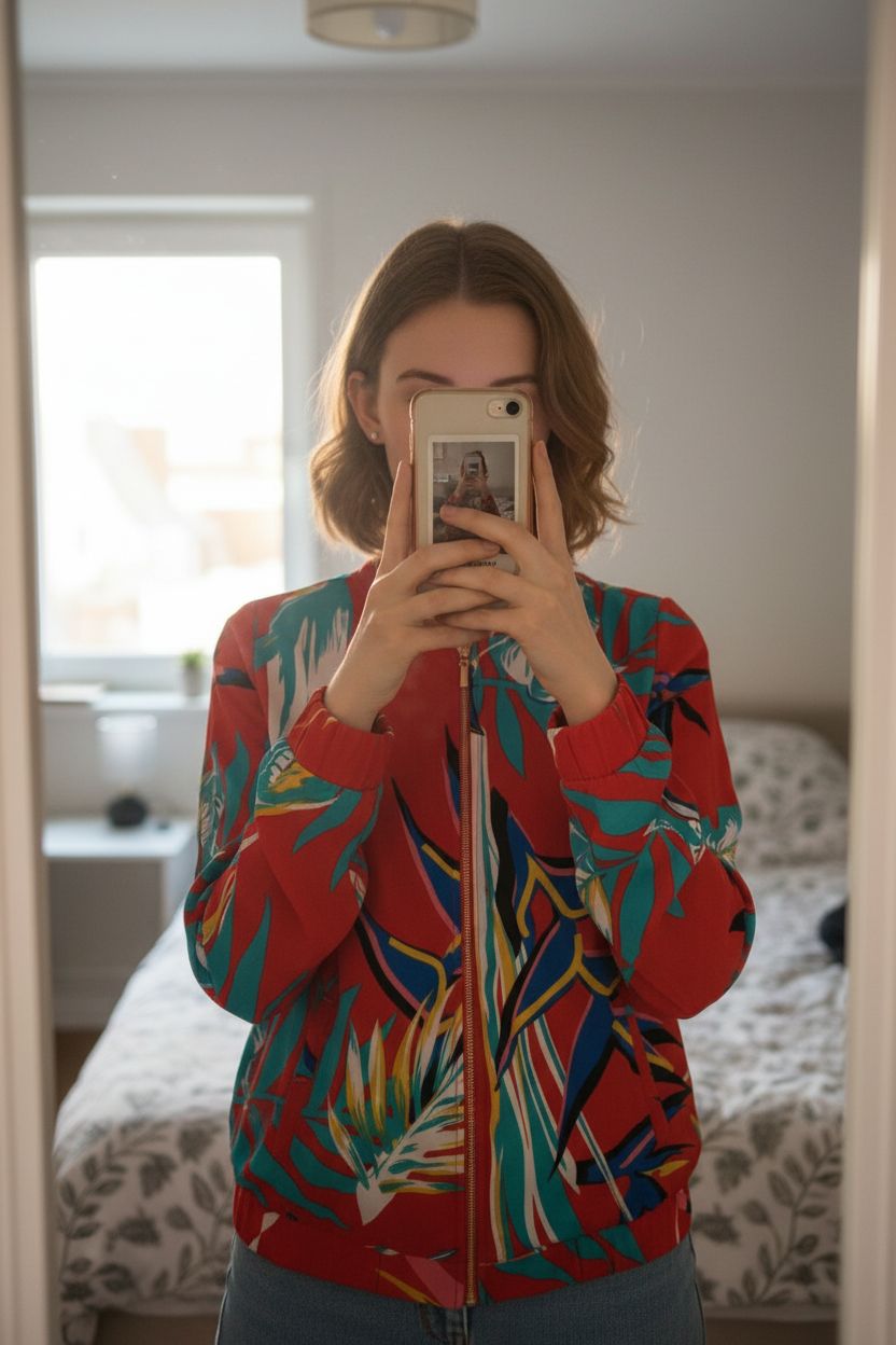 Veste bomber a motifs printemps été S Giacca Donna estate in piedi, rivolto verso la fotocamera, in una camera da letto con luce soffusa e luce naturale che filtra dalla finestra.