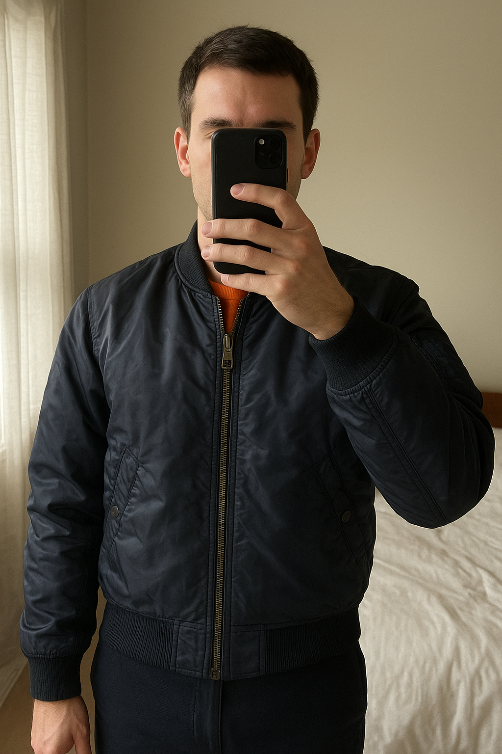 Veste Bomber - Vintage Bleu - Très bon état debout, face à la caméra, dans une chambre à la lumière douce, avec une lumière naturelle filtrant par la fenêtre.