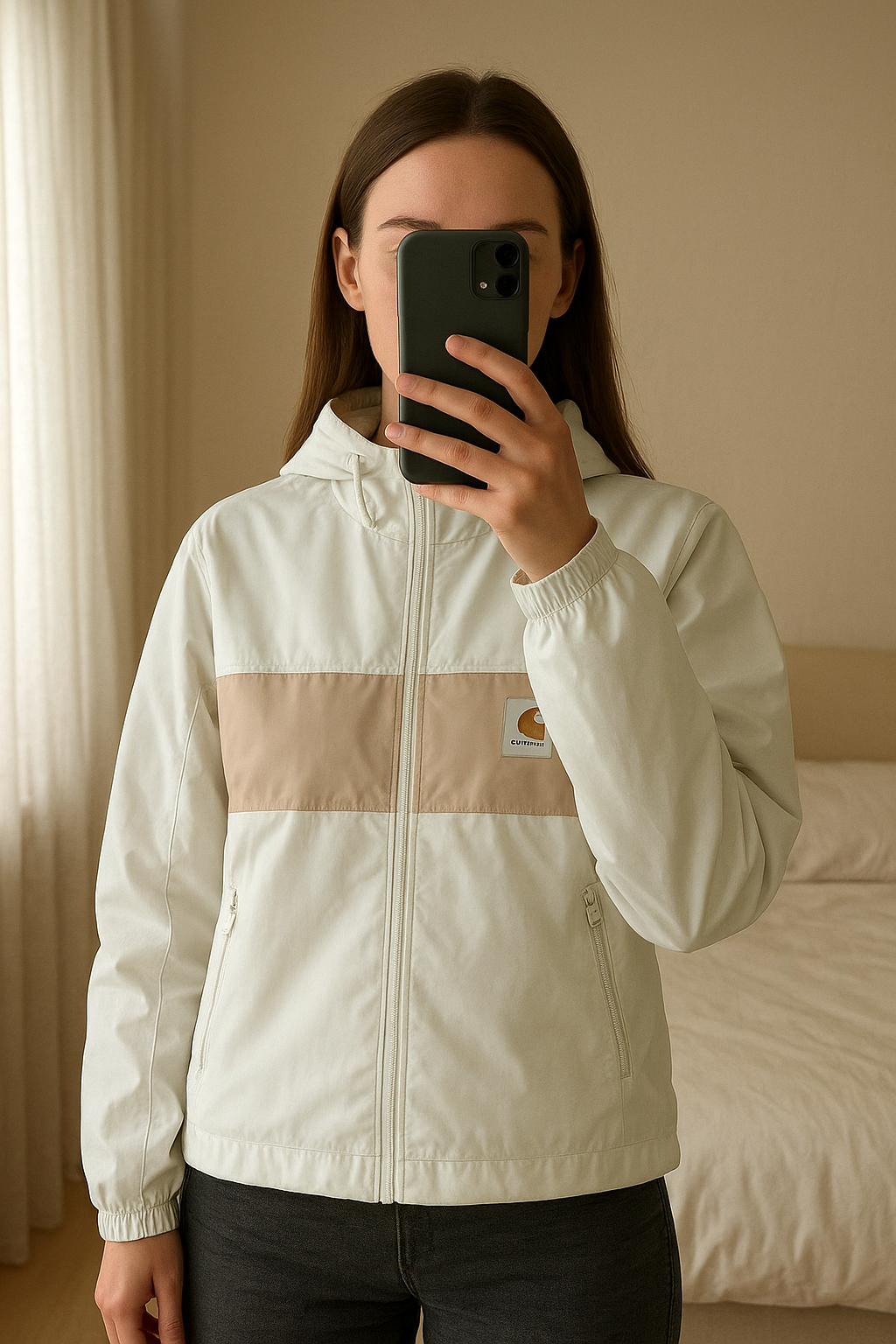 Veste à capuche Carhartt WIP avec étiquette 🧥 debout, face à la caméra, dans une chambre à la lumière douce, avec une lumière naturelle filtrant par la fenêtre.