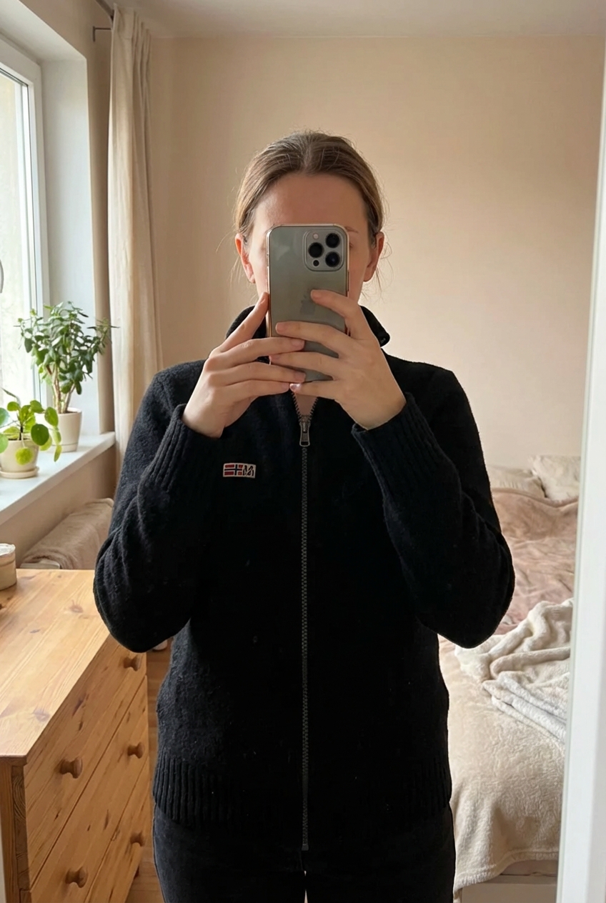 Veste cardigan gilet en laine Napapijri femme S - Giacca Lana donna S in piedi, rivolto verso la fotocamera, in una camera da letto con luce soffusa e luce naturale che filtra dalla finestra.