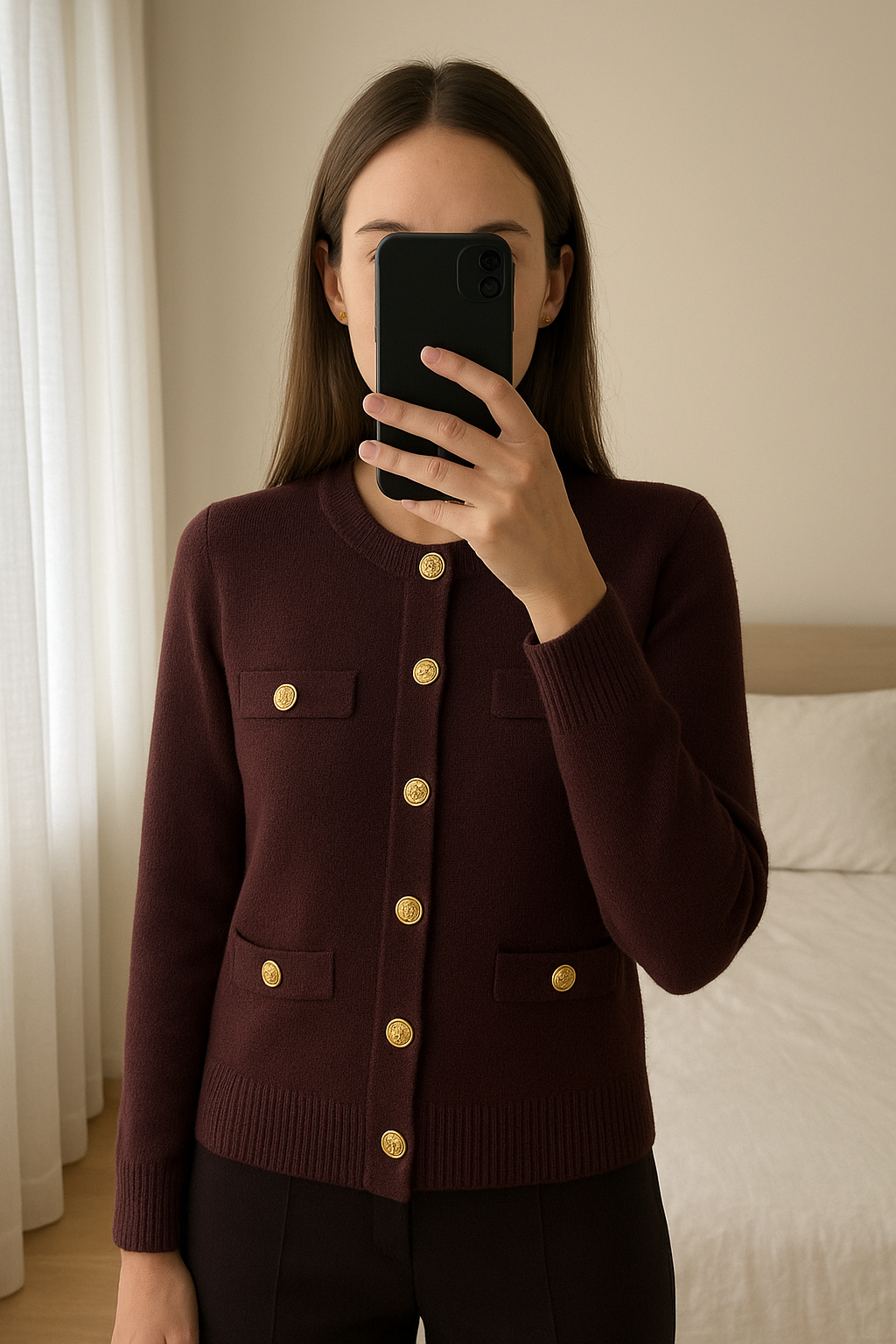 Veste courte bordeau Kiabi taille L debout, face à la caméra, dans une chambre à la lumière douce, avec une lumière naturelle filtrant par la fenêtre.