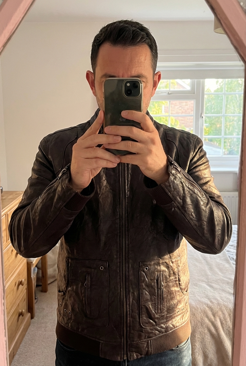 Veste cuir le temps des cerises XL debout, face à la caméra, dans une chambre à la lumière douce, avec une lumière naturelle filtrant par la fenêtre.