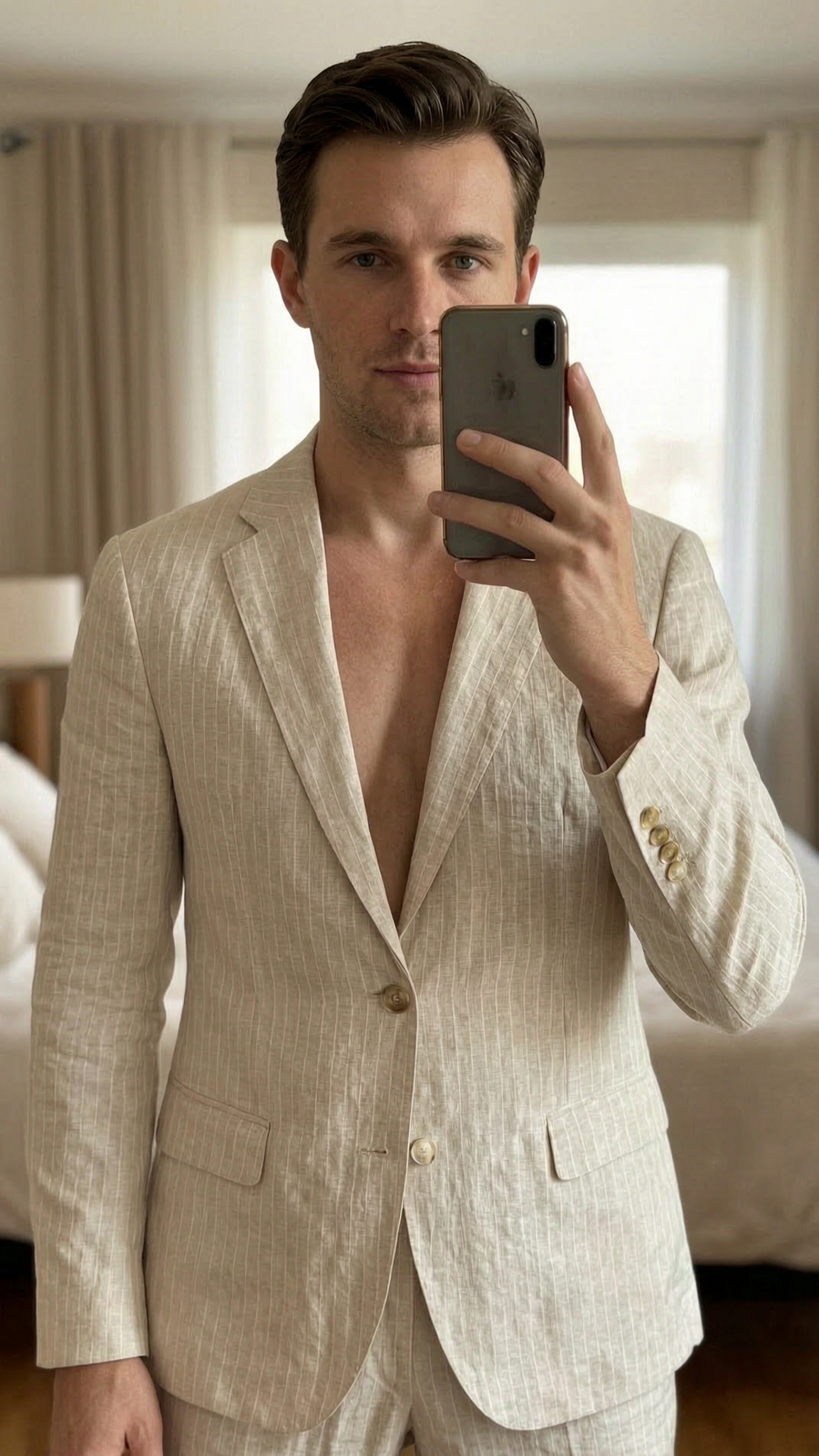 Veste de costume debout, face à la caméra, dans une chambre à la lumière douce, avec une lumière naturelle filtrant par la fenêtre.