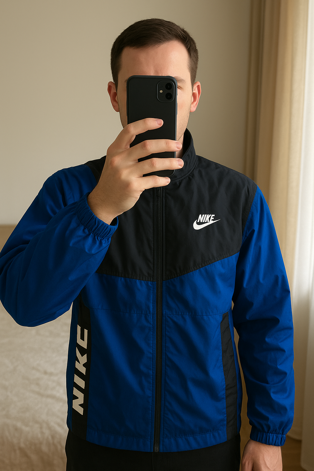 Veste De Sport Style Kway Nike Vintage Taille L très bon état debout, face à la caméra, dans une chambre à la lumière douce, avec une lumière naturelle filtrant par la fenêtre.