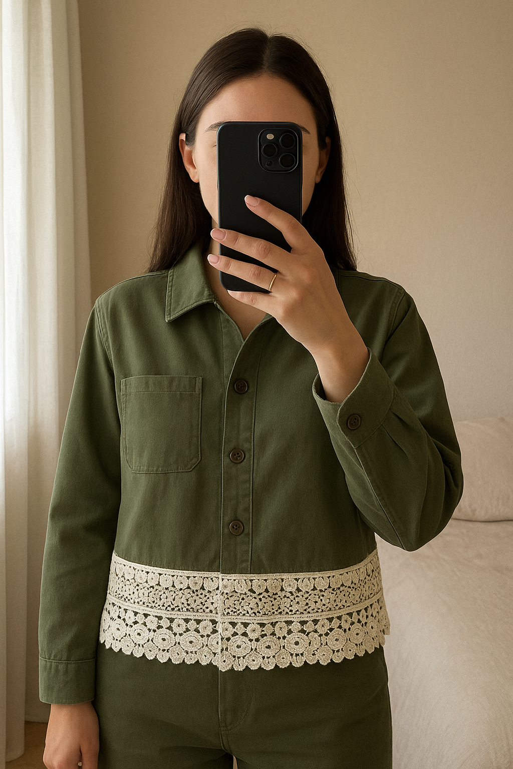 Veste en jean kaki avec dentelle – Style bohème debout, face à la caméra, dans une chambre à la lumière douce, avec une lumière naturelle filtrant par la fenêtre.