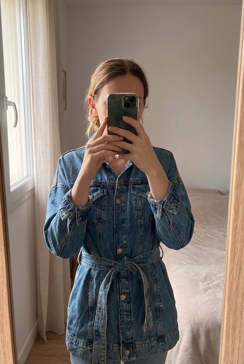 Veste en jean longue ceinturée Stradivarius – Taille S debout, face à la caméra, dans une chambre à la lumière douce, avec une lumière naturelle filtrant par la fenêtre.