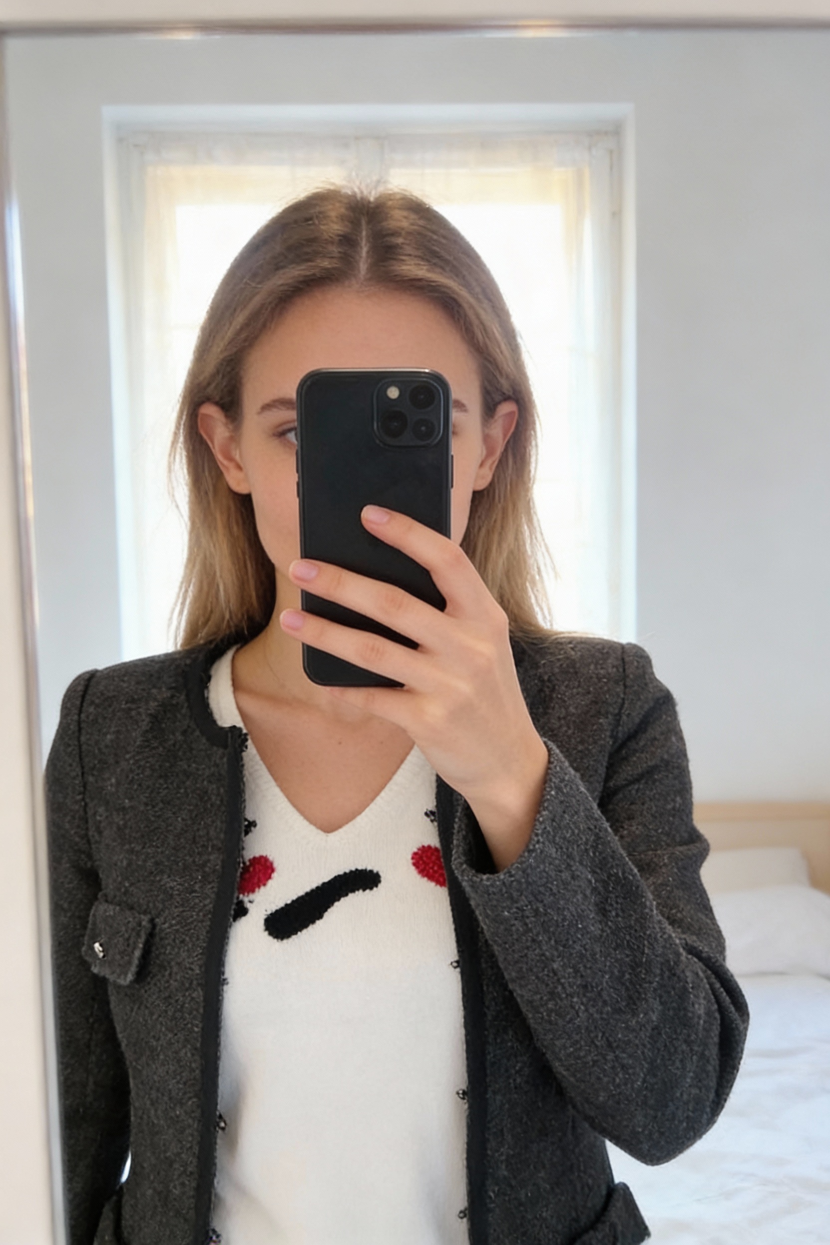 Veste femme tendance gris anthracite-sinequanone-taille 38 debout, face à la caméra, dans une chambre à la lumière douce, avec une lumière naturelle filtrant par la fenêtre.