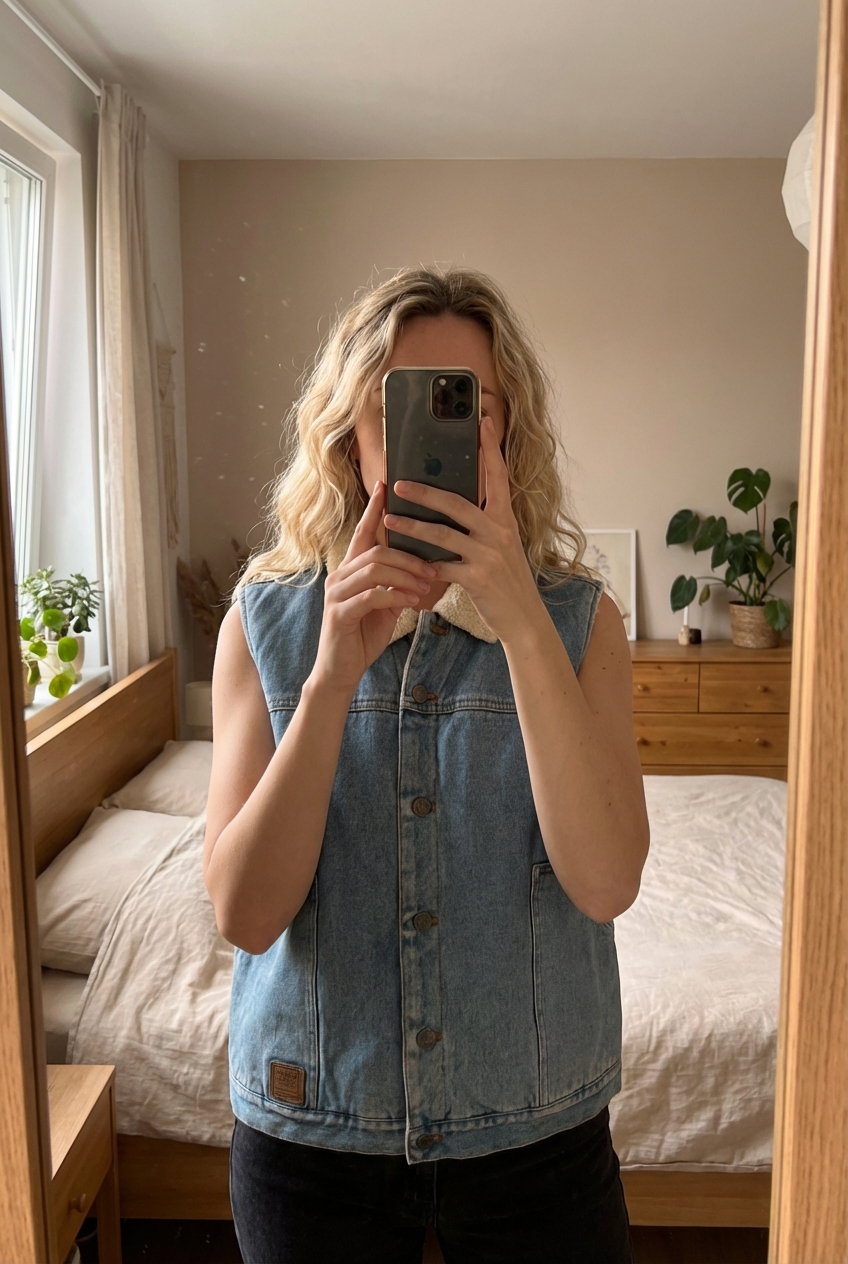 Veste jean sans manches Ralph Lauren debout, face à la caméra, dans une chambre à la lumière douce, avec une lumière naturelle filtrant par la fenêtre.