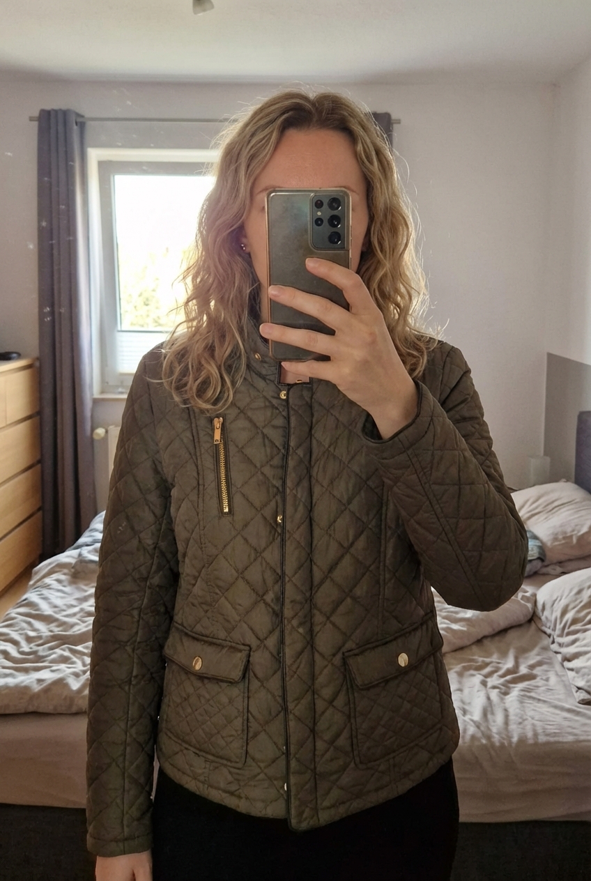 Veste kaki debout, face à la caméra, dans une chambre à la lumière douce, avec une lumière naturelle filtrant par la fenêtre.
