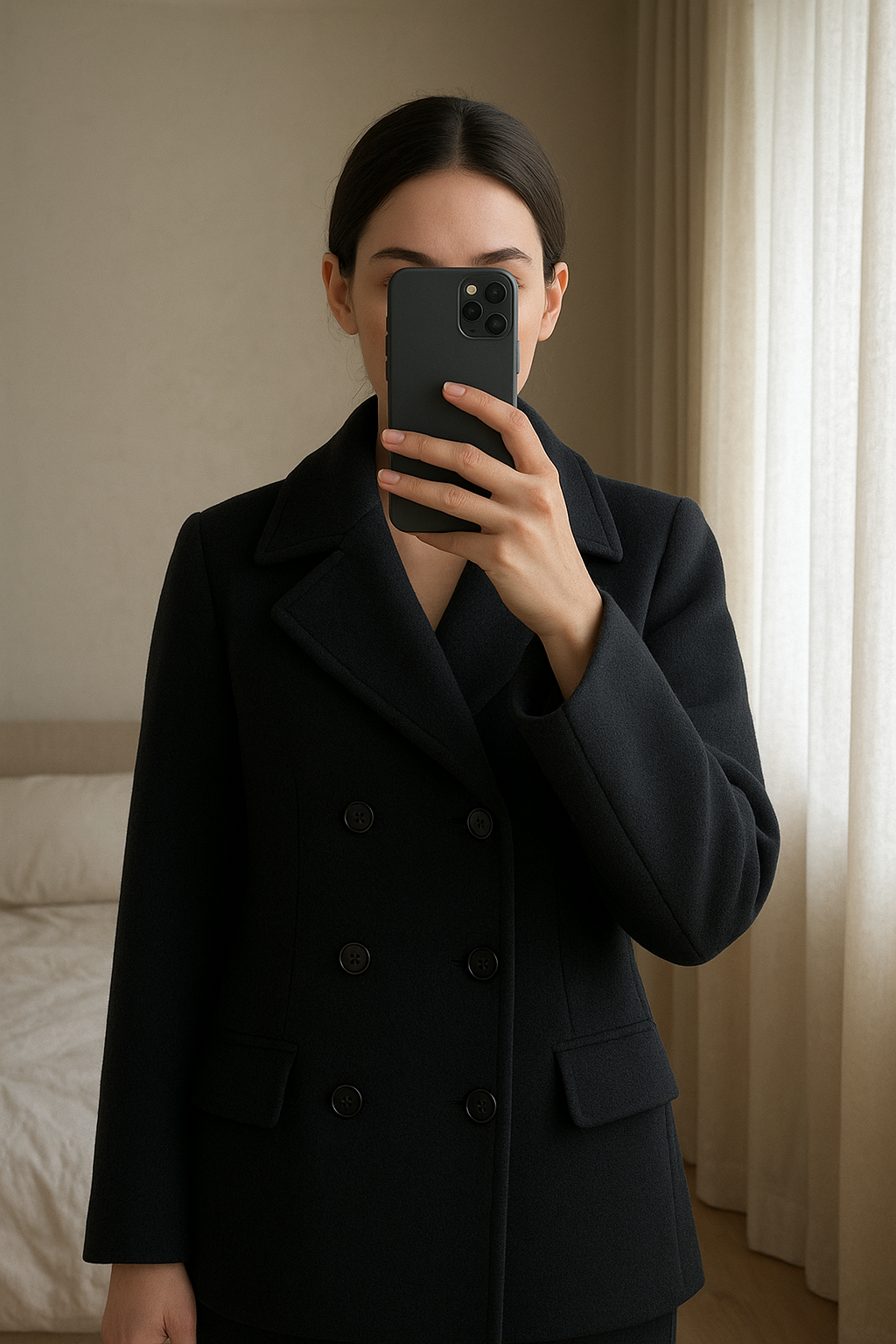 Veste manteau caban laine chic marine | COS | Taille L | Femme debout, face à la caméra, dans une chambre à la lumière douce, avec une lumière naturelle filtrant par la fenêtre.