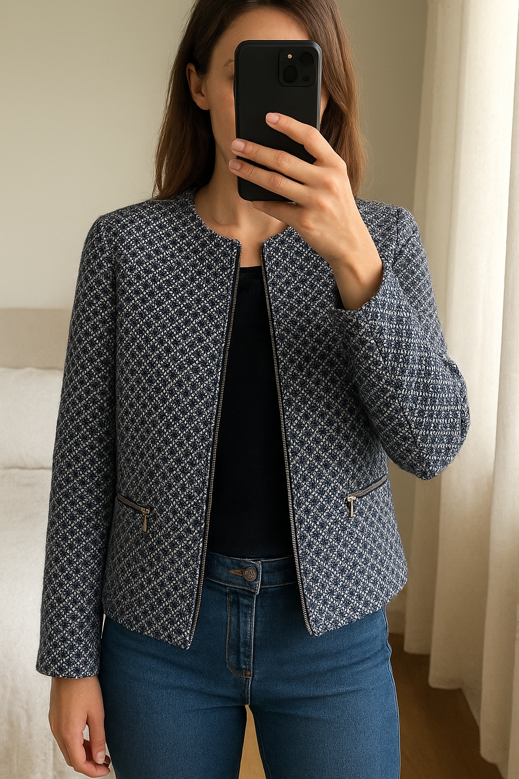 Veste / manteau court debout, face à la caméra, dans une chambre à la lumière douce, avec une lumière naturelle filtrant par la fenêtre.
