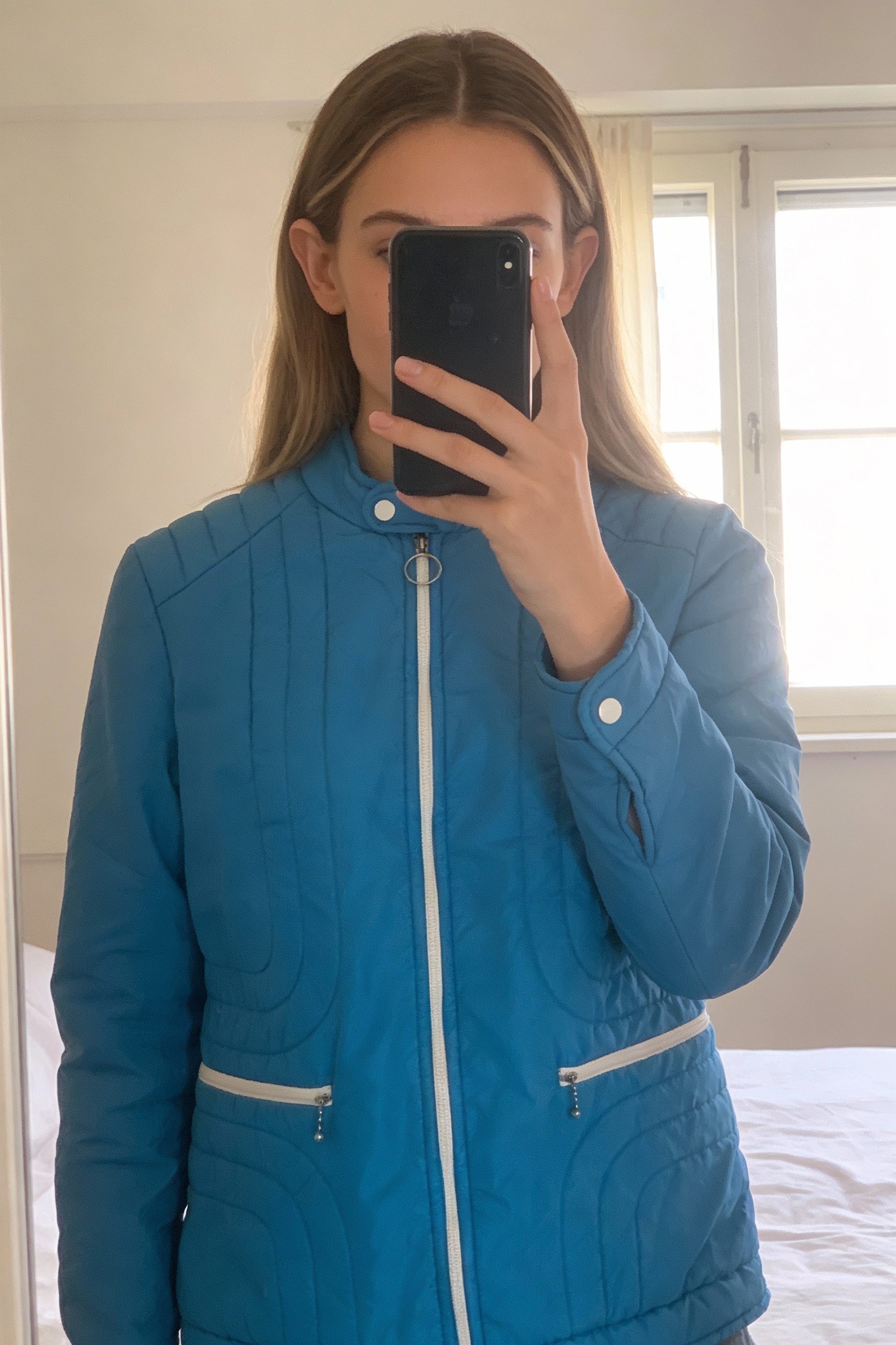 Veste matelassée bleue courte debout, face à la caméra, dans une chambre à la lumière douce, avec une lumière naturelle filtrant par la fenêtre.