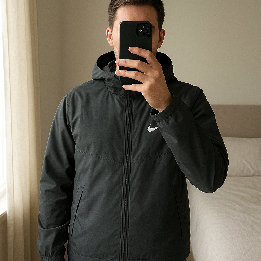 Veste nike Miller grise debout, face à la caméra, dans une chambre à la lumière douce, avec une lumière naturelle filtrant par la fenêtre.