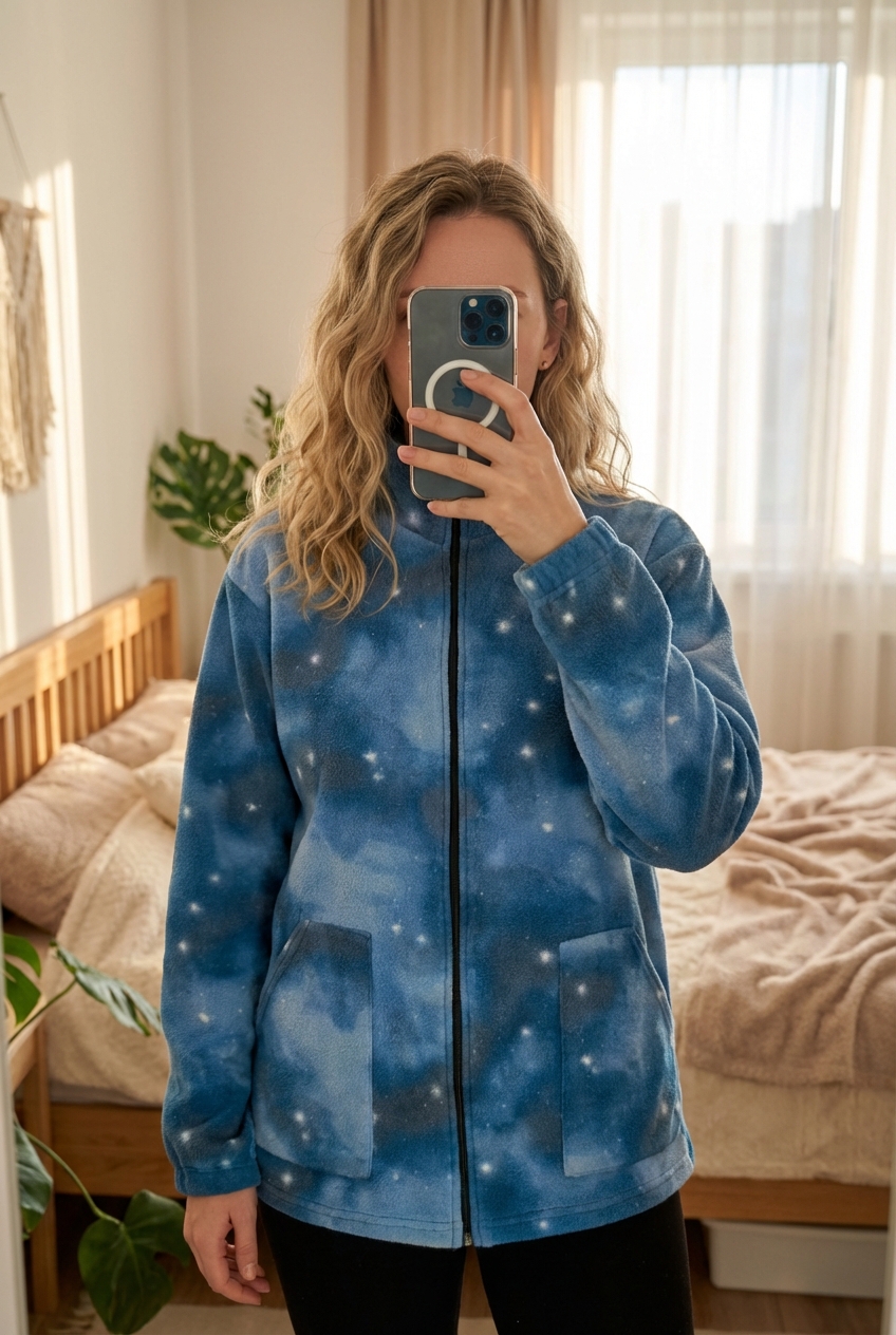 Une personne en Veste Polaire Crazy Fleece Vintage Y2K Galaxy patern Bleu L debout, face à la caméra, dans une chambre à la lumière douce, avec une lumière naturelle filtrant par la fenêtre.