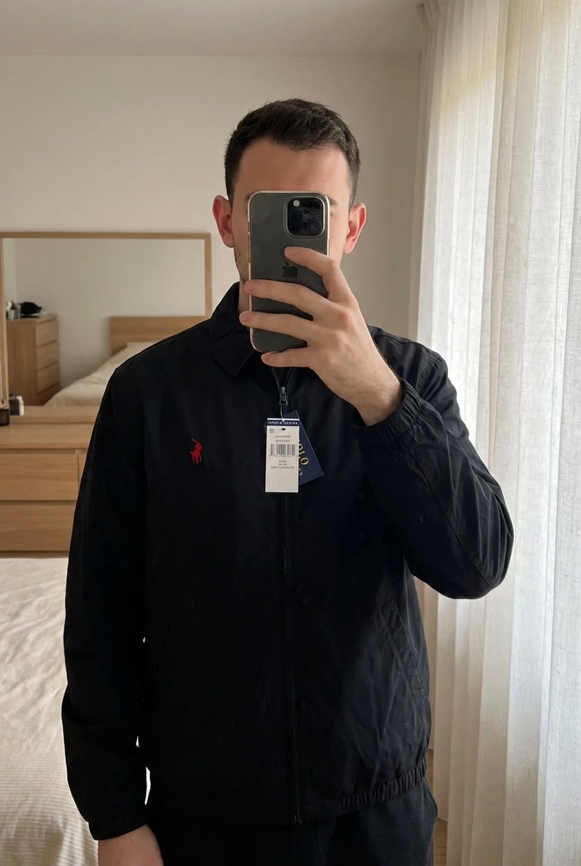 Veste Ralph Lauren debout, face à la caméra, dans une chambre à la lumière douce, avec une lumière naturelle filtrant par la fenêtre.
