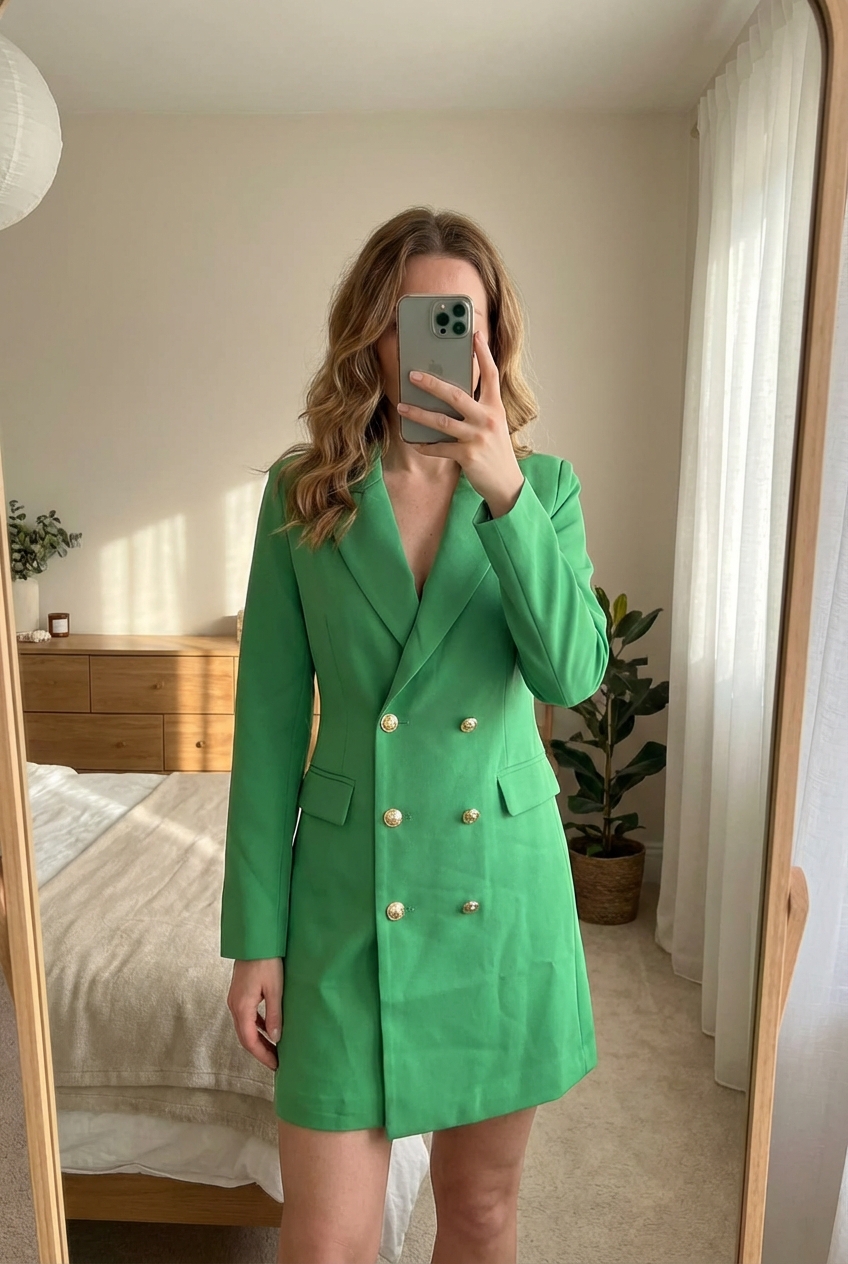 Une personne en Veste robe blazer verte avec boutonnage doré - femme - M - Attentif Paris 🎀 neuve étiquetée debout, face à la caméra, dans une chambre à la lumière douce, avec une lumière naturelle filtrant par la fenêtre.