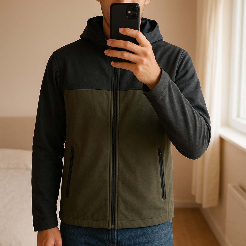Veste running jack &jones debout, face à la caméra, dans une chambre à la lumière douce, avec une lumière naturelle filtrant par la fenêtre.