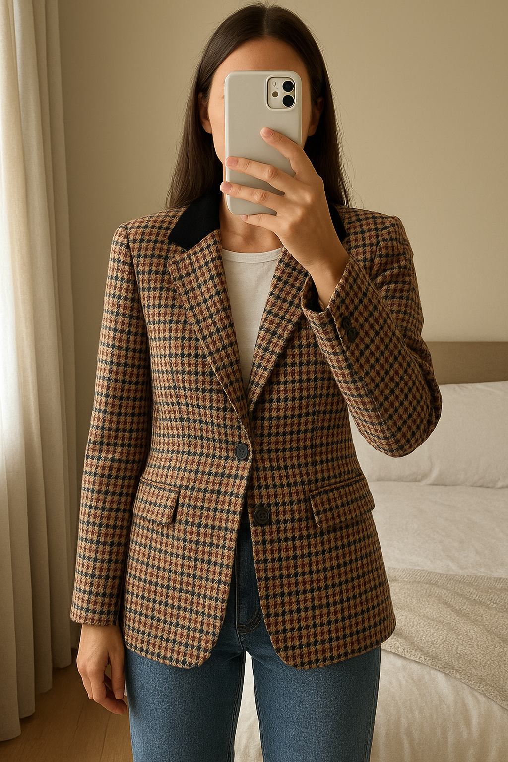 Veste Sandro taille 38 debout, face à la caméra, dans une chambre à la lumière douce, avec une lumière naturelle filtrant par la fenêtre.
