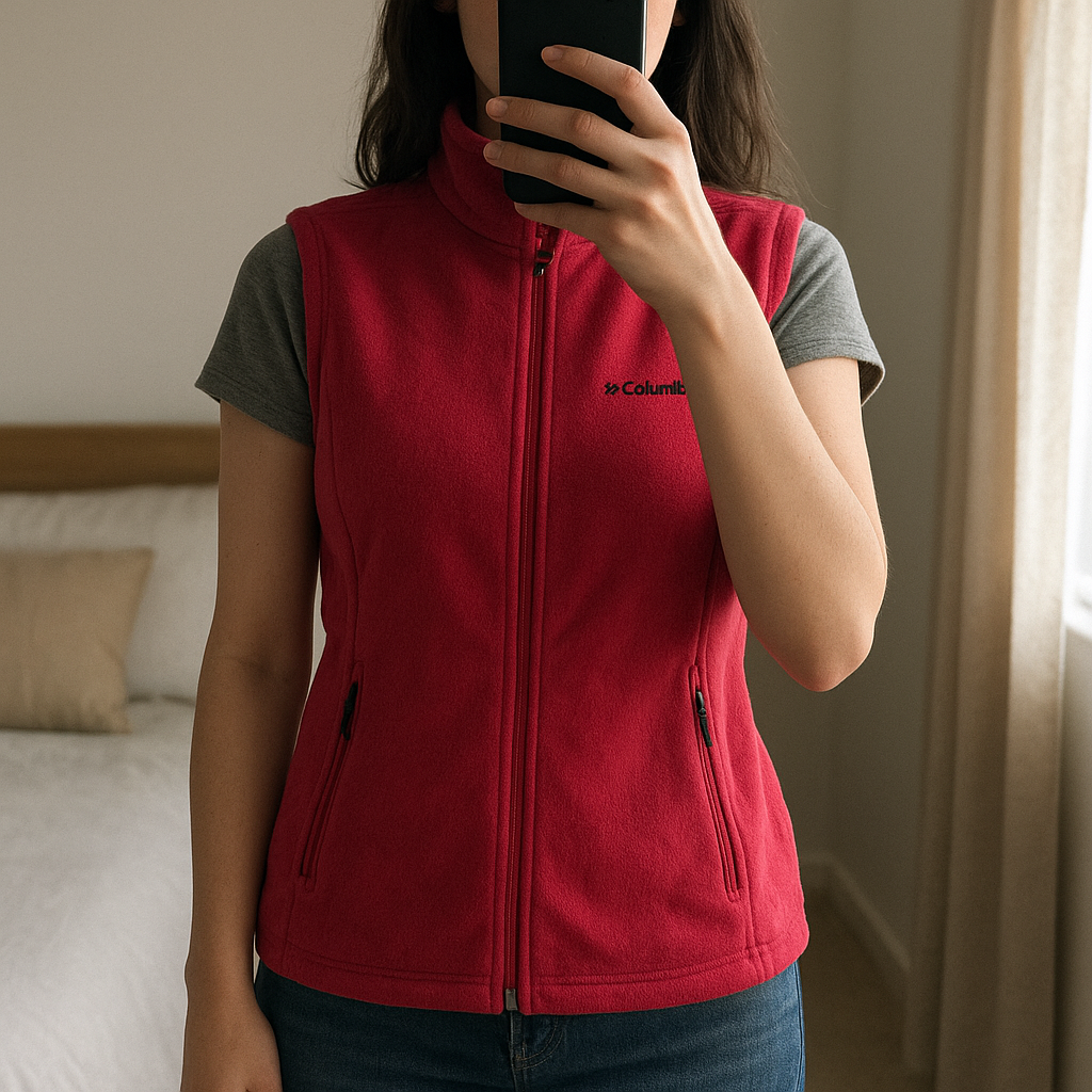Veste Sans Manche polaire Columbia Rose Fuchsia S debout, face à la caméra, dans une chambre à la lumière douce, avec une lumière naturelle filtrant par la fenêtre.