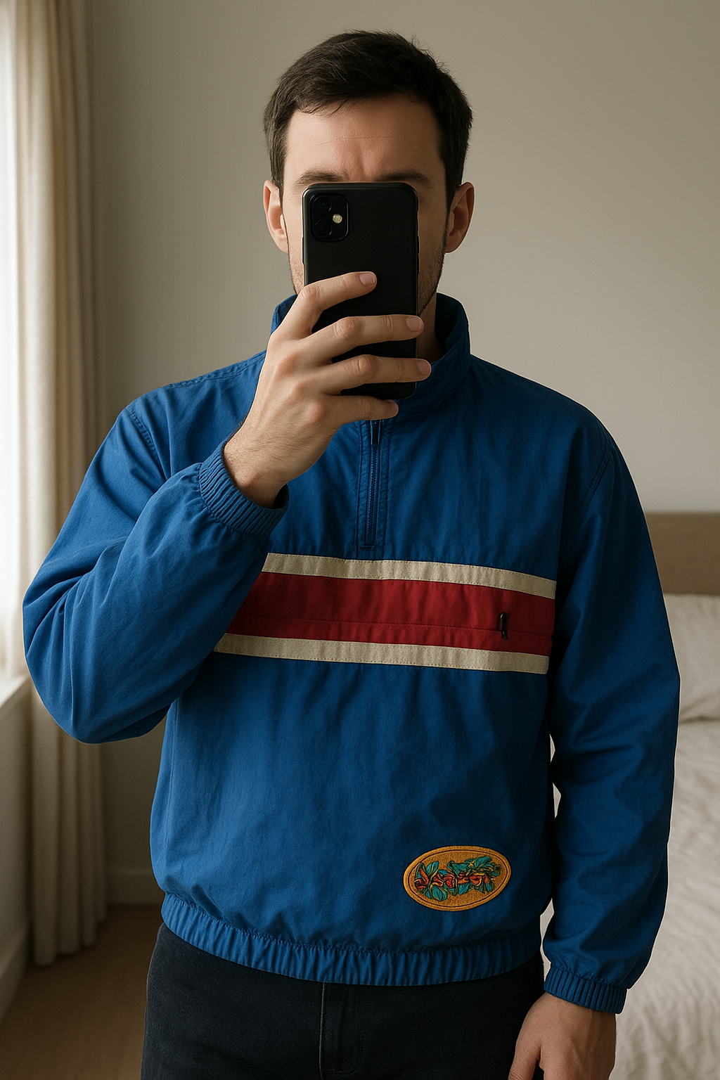 Veste snowboard ski debout, face à la caméra, dans une chambre à la lumière douce, avec une lumière naturelle filtrant par la fenêtre.