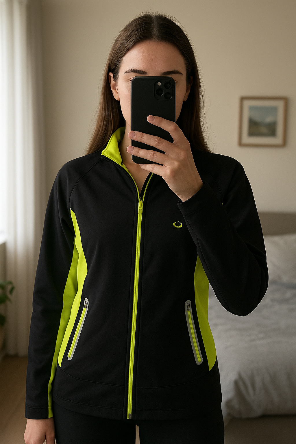 Veste sport waterproof debout, face à la caméra, dans une chambre à la lumière douce, avec une lumière naturelle filtrant par la fenêtre.