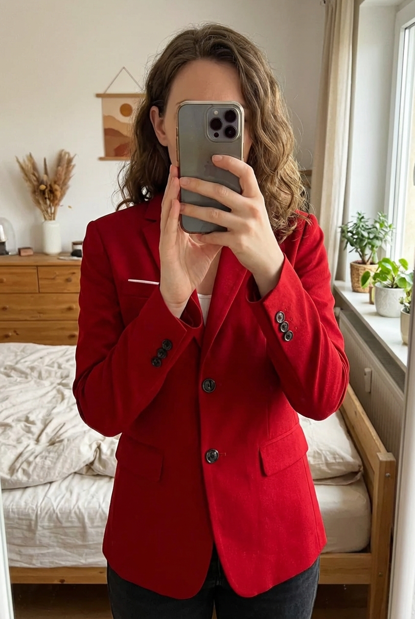 Veste tailleur debout, face à la caméra, dans une chambre à la lumière douce, avec une lumière naturelle filtrant par la fenêtre.