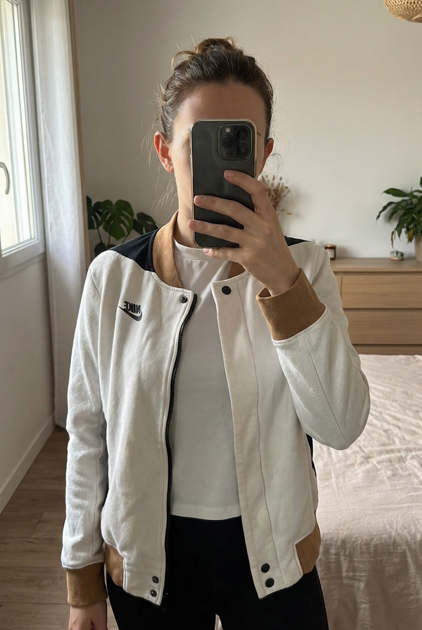 Veste teddy Nike debout, face à la caméra, dans une chambre à la lumière douce, avec une lumière naturelle filtrant par la fenêtre.