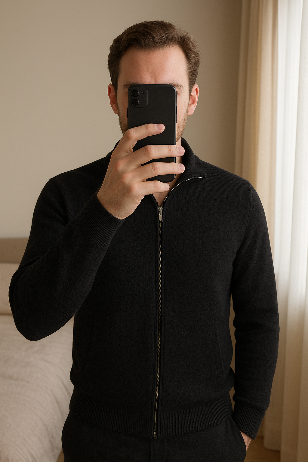 Veste zippée Massimo Dutti bleu foncée debout, face à la caméra, dans une chambre à la lumière douce, avec une lumière naturelle filtrant par la fenêtre.