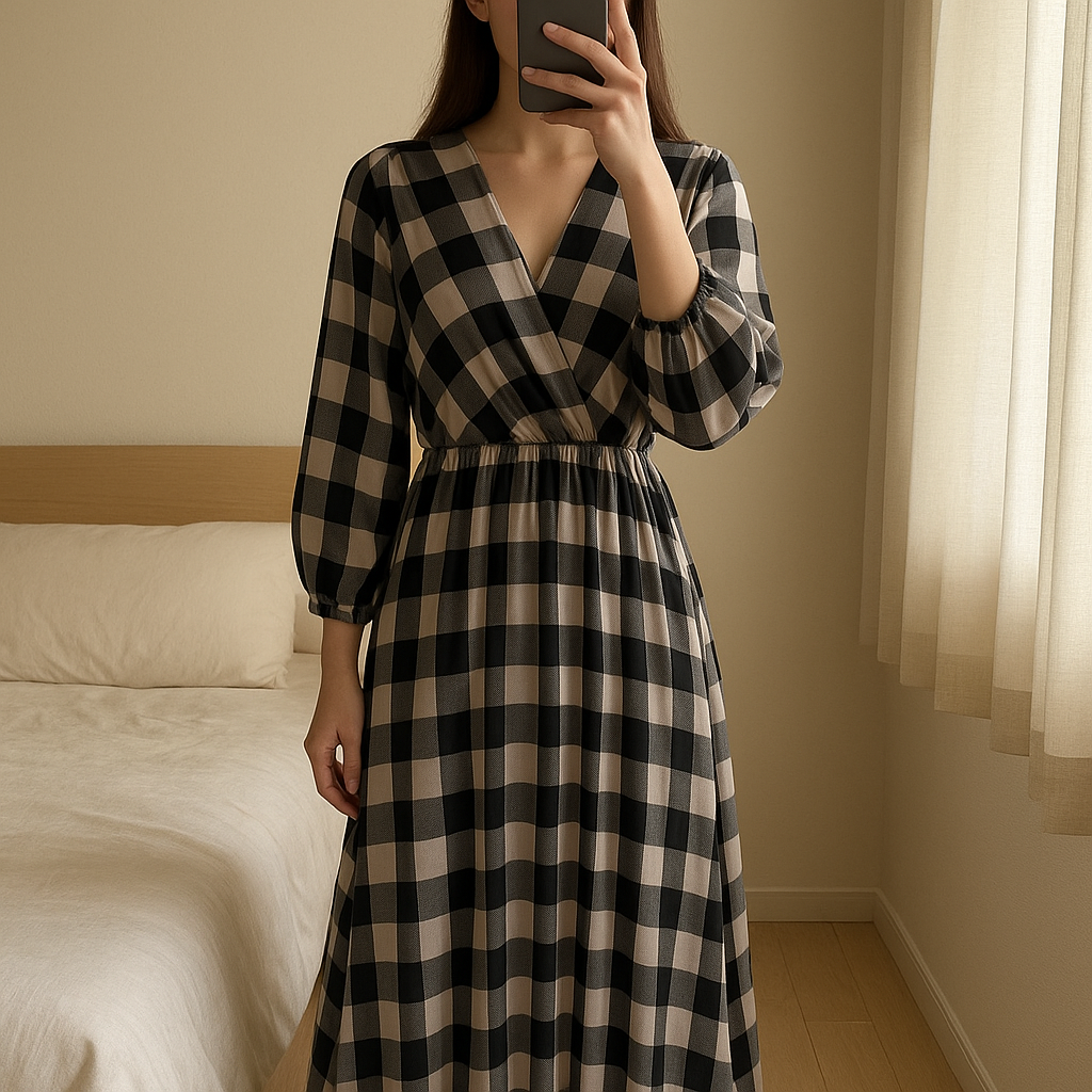 Vestito midi in piedi, rivolto verso la fotocamera, in una camera da letto con luce soffusa e luce naturale che filtra dalla finestra.