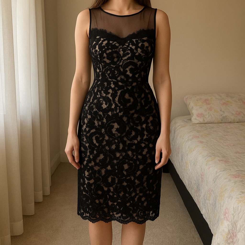 Vestito pizzo nero in piedi, rivolto verso la fotocamera, in una camera da letto con luce soffusa e luce naturale che filtra dalla finestra.