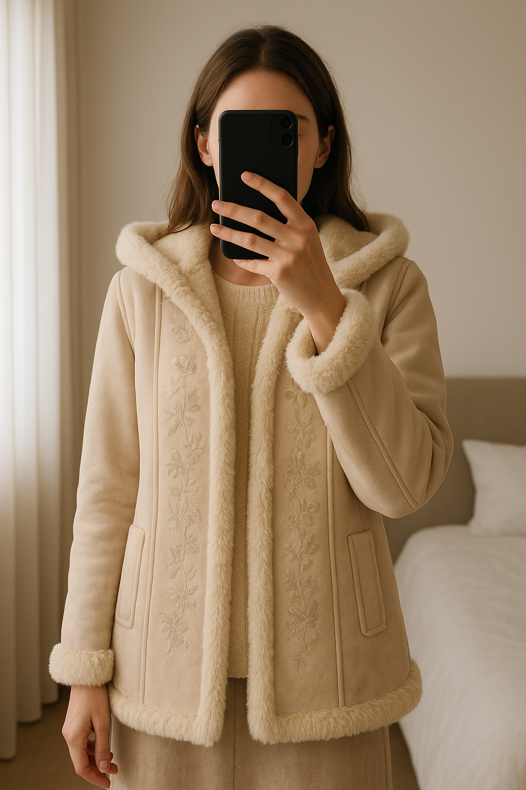 Vintage Afghan Mantel mit Fell/ Penny Lane Mantel wie Gr.M aufrecht stehend, der Kamera zugewandt, in einem sanft beleuchteten Schlafzimmer, mit natürlichem Licht, das durch ein Fenster fällt.