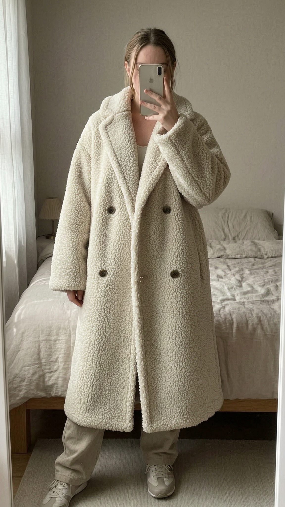 Women’s H&M Cream Teddy Borg Coat – Double Breasted Size Medium standing straight facing the camera, in a softly lit bedroom setting, with gentle natural light filtering through a window.