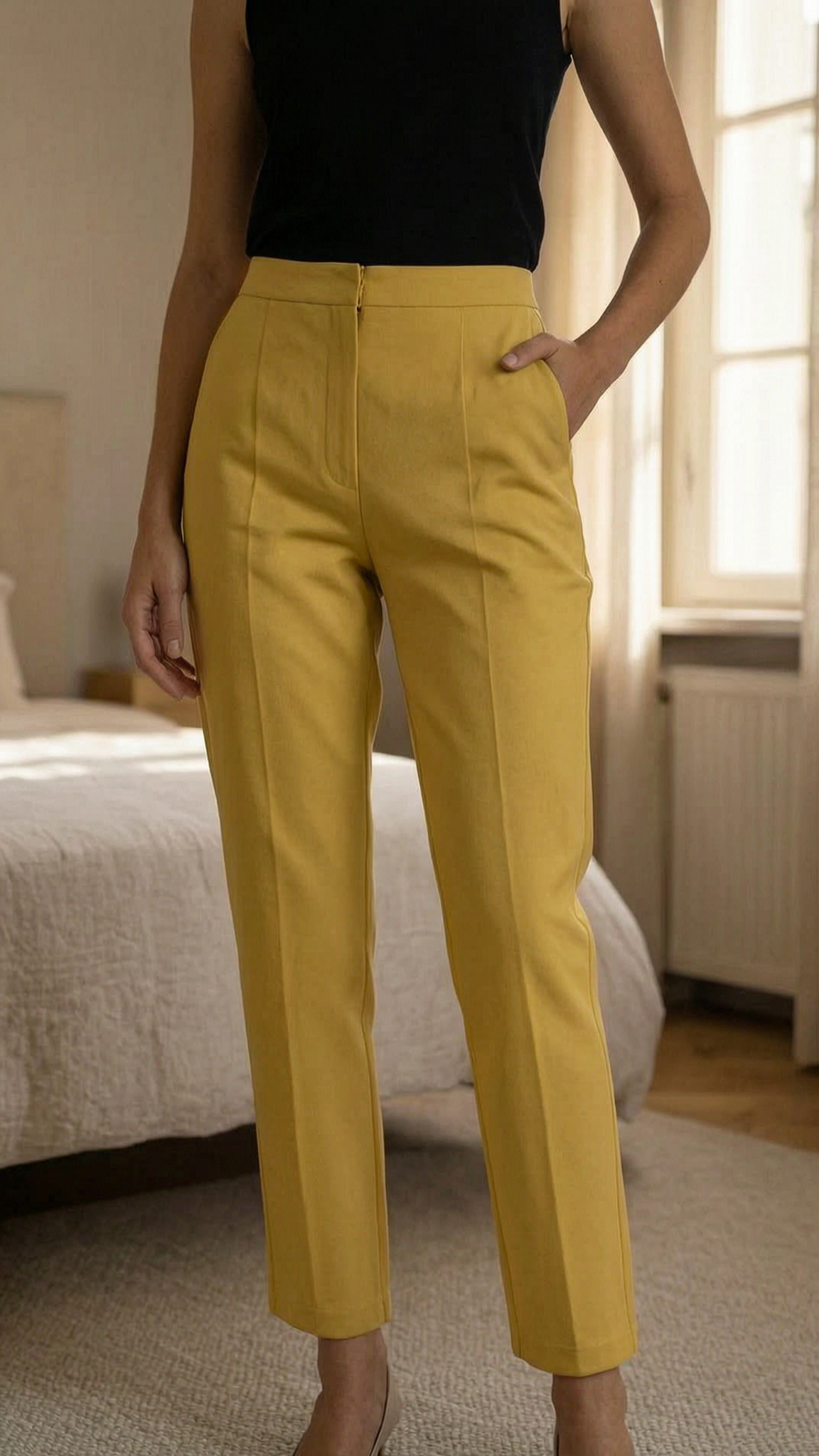 Zucchero Hose Gelb Gr. 36 Stretch eleganter Look Büro Freizeit Neu aufrecht stehend, der Kamera zugewandt, in einem sanft beleuchteten Schlafzimmer, mit natürlichem Licht, das durch ein Fenster fällt.