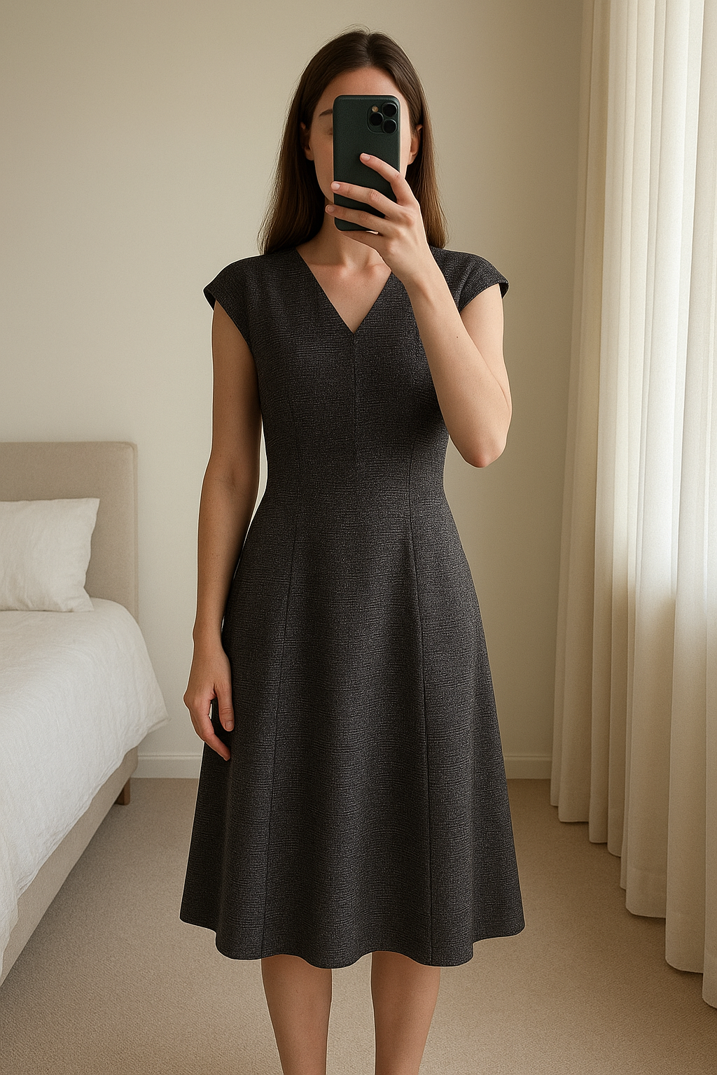 Abito Mila Schön in lana vergine senza maniche – linea svasata, effetto raffinato in piedi, rivolto verso la fotocamera, in una camera da letto con luce soffusa e luce naturale che filtra dalla finestra.