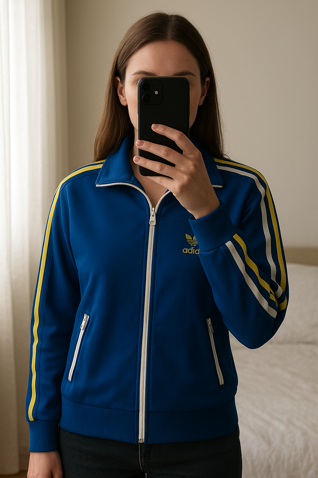 😵 Adidas Veste Survetement édition limitée de pie, mirando a la cámara, en un dormitorio con luz suave y natural filtrándose por la ventana.