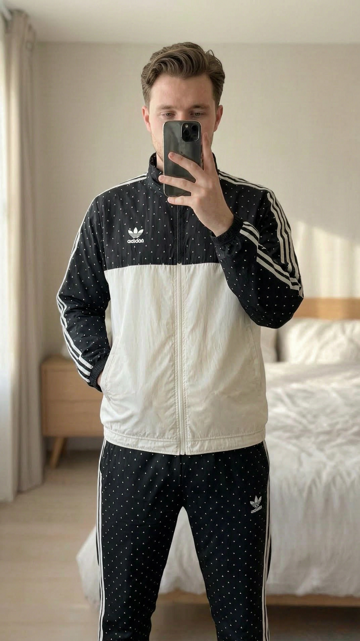 adidas x Pharrell Williams Tracksuit - Größe L - Trainingsanzug - Rare Piece aufrecht stehend, der Kamera zugewandt, in einem sanft beleuchteten Schlafzimmer, mit natürlichem Licht, das durch ein Fenster fällt.