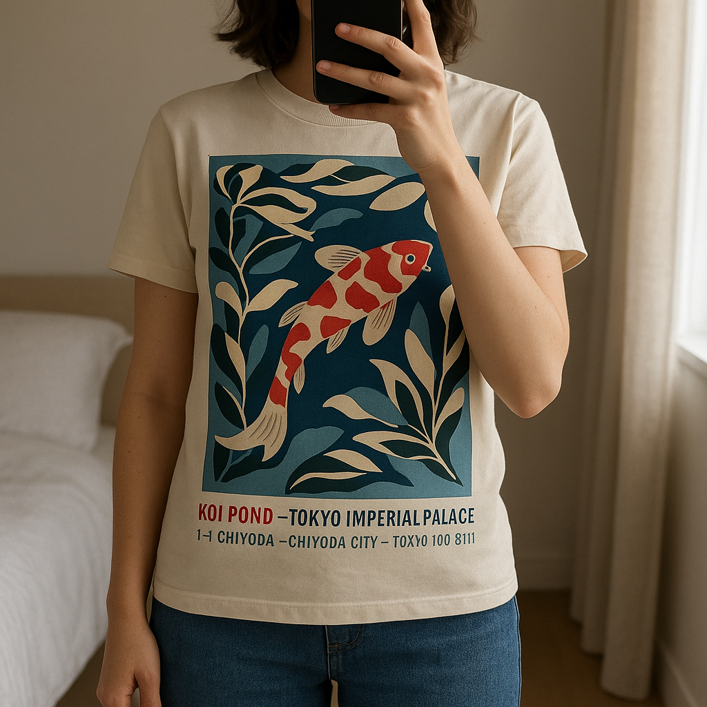 Affiche anime japonais carpe koï -Style Kawaii/Japonais debout, face à la caméra, dans une chambre à la lumière douce, avec une lumière naturelle filtrant par la fenêtre.
