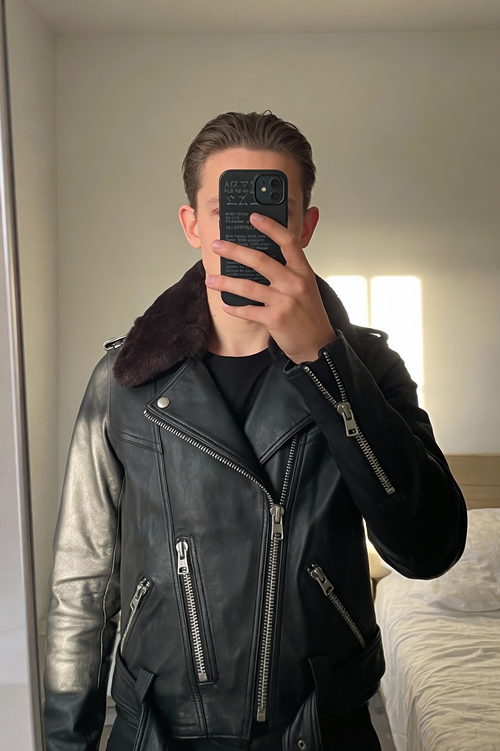 Allsaints veste en cuir debout, face à la caméra, dans une chambre à la lumière douce, avec une lumière naturelle filtrant par la fenêtre.