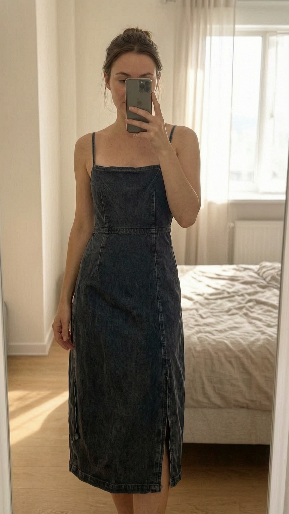 ASOS Design - Robe en jean à fente dos nu - taille XS/34 - Couleur Noir Gris - État tres bon debout, face à la caméra, dans une chambre à la lumière douce, avec une lumière naturelle filtrant par la fenêtre.